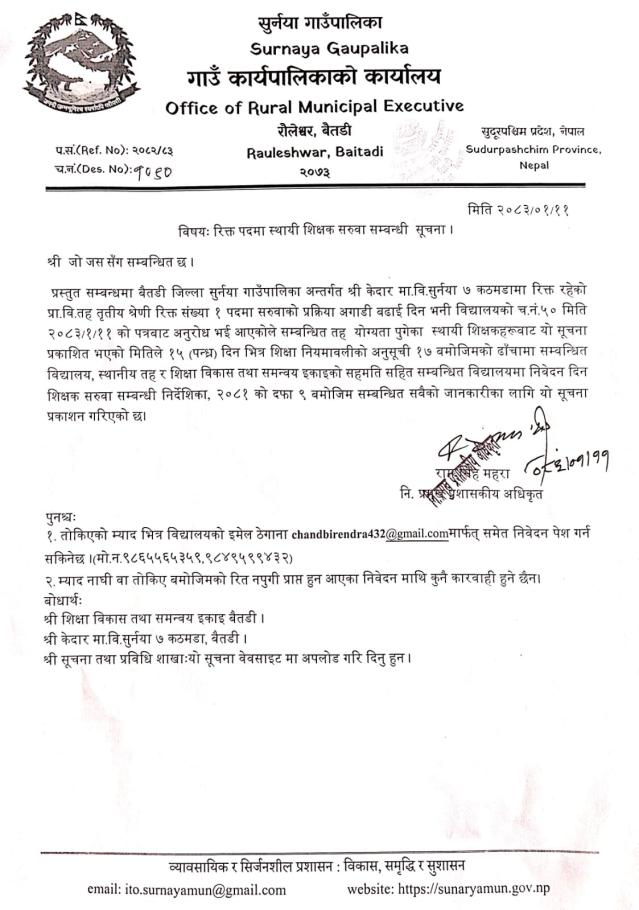 रिक्त पदमा स्थायी शिक्षक सरुवा सम्बन्धी सूचना ।